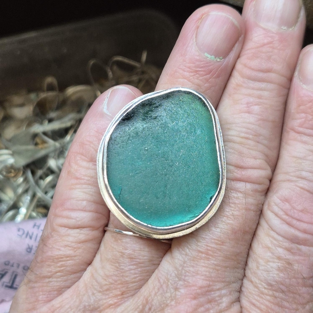 Size Q Pale Aqua Sea Glass and Sterling Silver Ring Fully Hallmarked